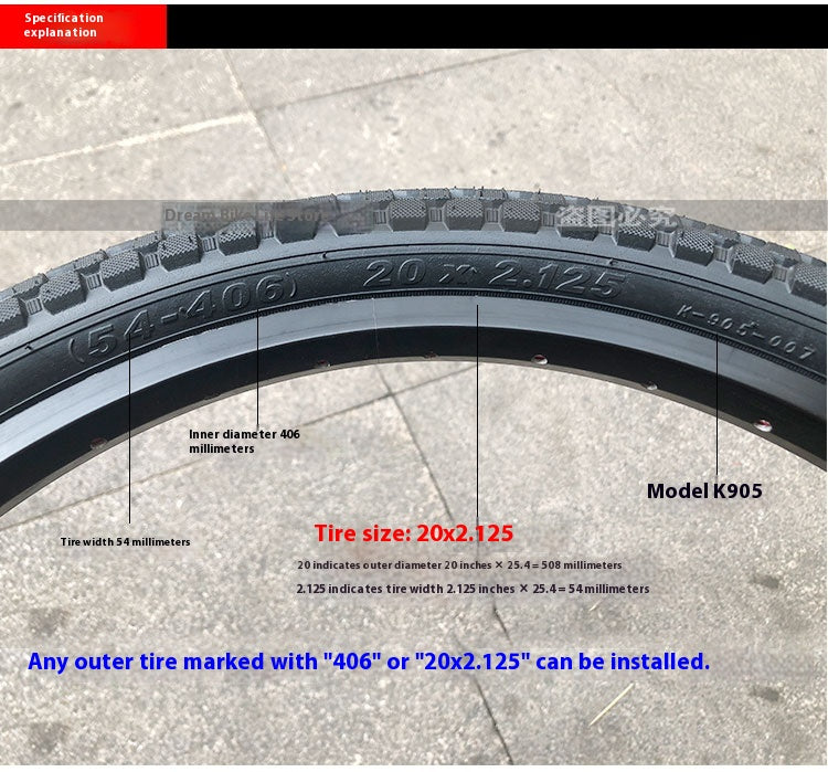 Tackle trails and country roads with confidence using the Jianda K905 20 × 2.125 mountain‑bike tire. This size fits 20‑inch rims and offers a wide 2.125‑inch profile for stable handling and shock absorption. The K905’s inverted tread design and knurled surface are low profile and fast‑rolling without sacrificing traction